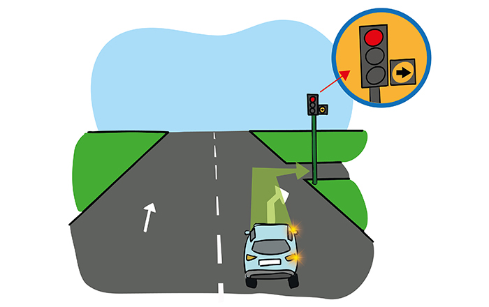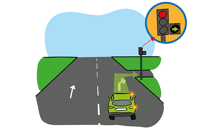 En esta situación, la flecha doble sobre el carril derecho permite al conductor girar a la derecha o esperar y seguir de frente cuando el semáforo principal cambie a verde. Sin embargo, es obligatorio seguir la indicación de la flecha verde siempre que se impida el paso a vehículos que circulen detrás y que indiquen su intención de girar. En estos dos últimos casos (3 y 4), es obligatorio dar prioridad de paso a todos los vehículos que ya circulan por la vía a la que se accede.