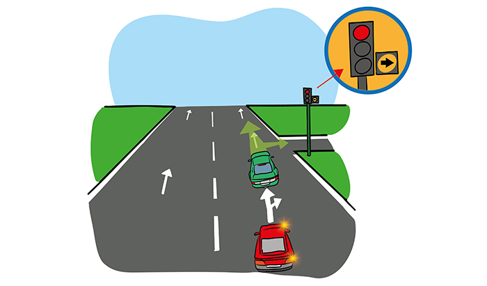 Con el semáforo principal en rojo, en el auxiliar se enciende una flecha verde, ¿qué debe hacer el conductor situado en el carril derecho, señalizado con una flecha de giro obligatorio? Seguir la flecha y girar a la derecha en el momento en que el semáforo auxiliar lo permita, incluso aunque no haya vehículos detrás pidiendo paso. En este caso, seguir de frente está doblemente prohibido: por el semáforo principal, en rojo, y por la flecha pintada en el carril, que sólo permite girar a la derecha.