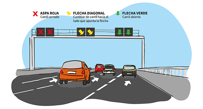 Sus señales son de tres tipos: una luz verde en forma de flecha permite el paso (aunque no exime del cumplimiento de otras señales), un aspa roja prohíbe circular y una flecha amarilla diagonal informa al conductor de que el carril se va a cerrar próximamente y debe desplazarse al carril contiguo, al que apunta.