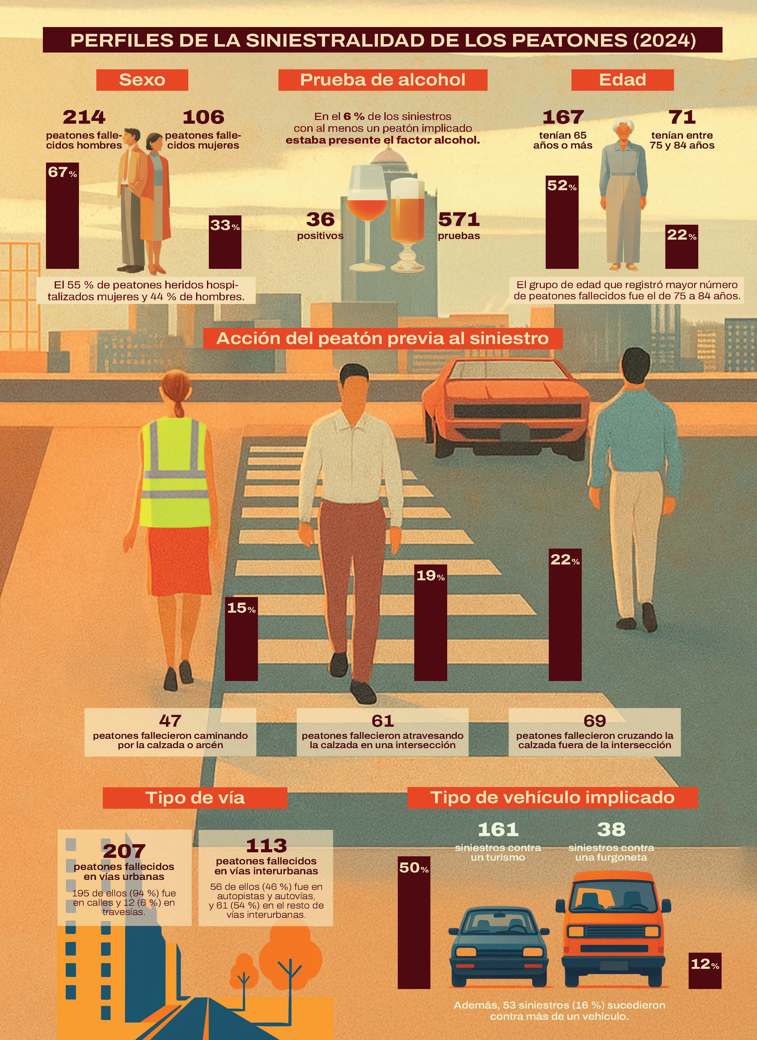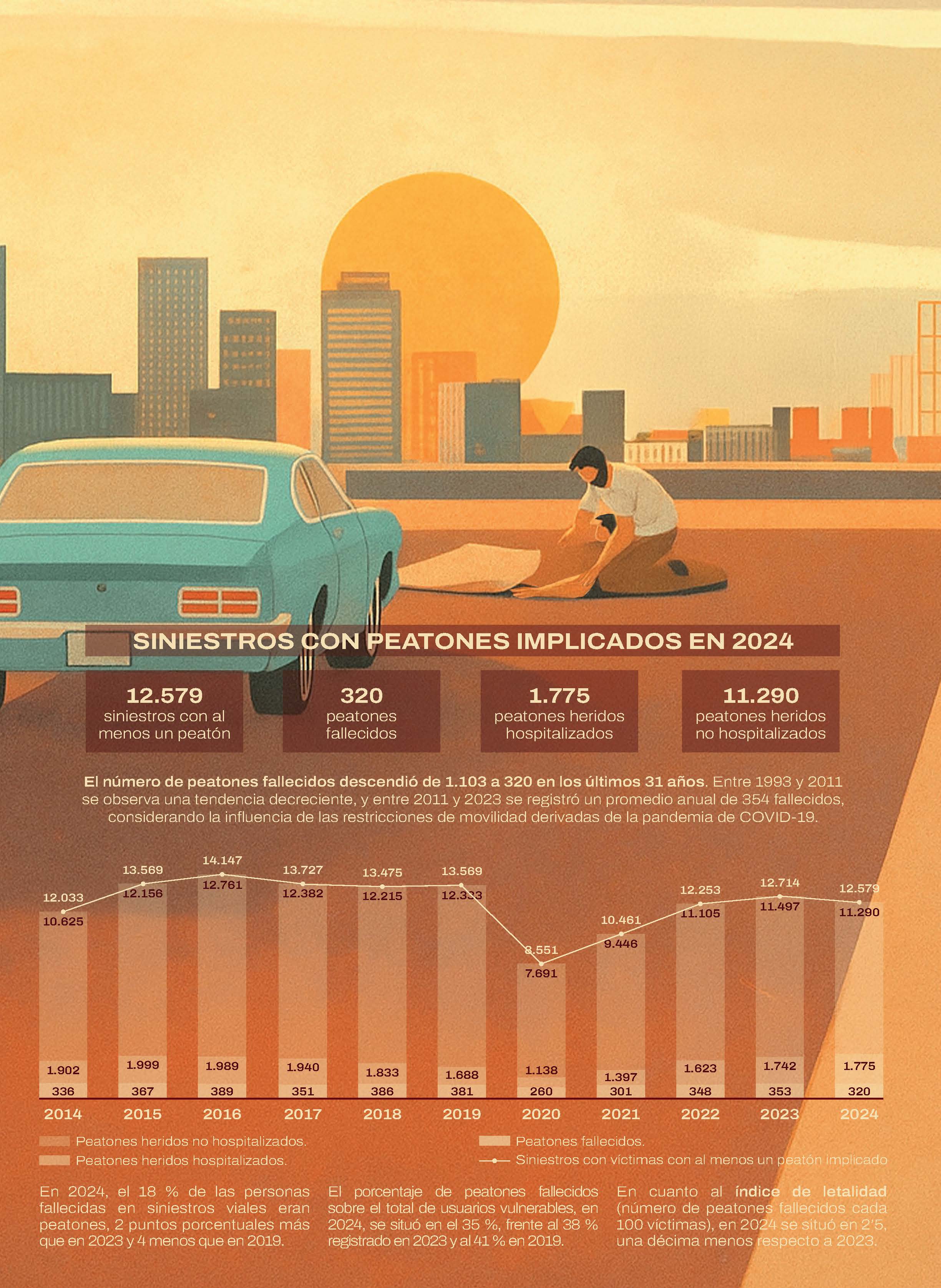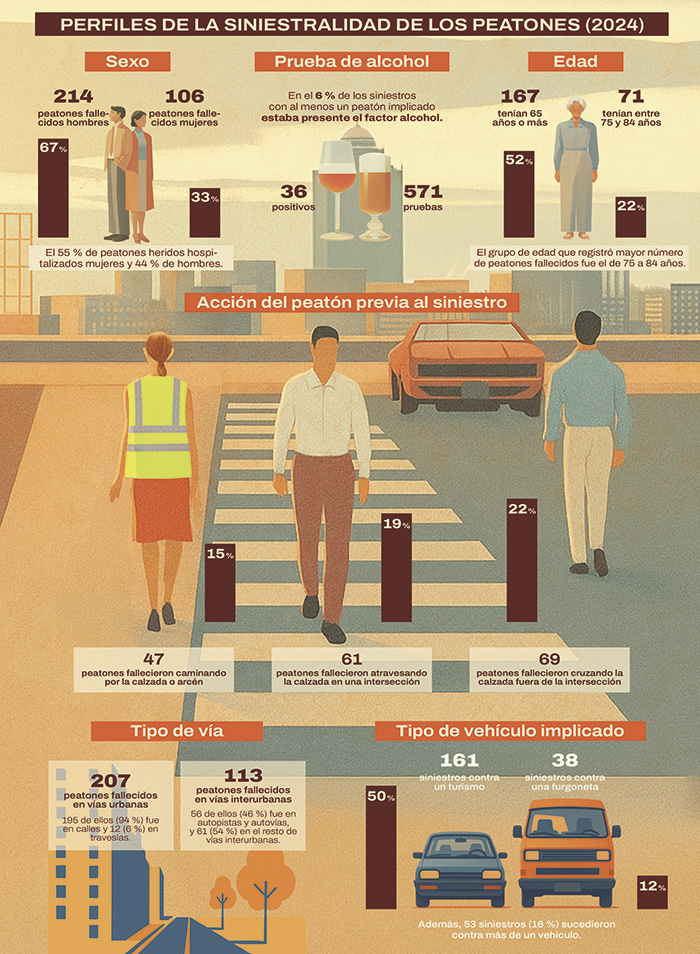 En 2024, el número de siniestros en los que al menos un peatón resultó víctima se situó en 12.579, en los cuales hubo 320 peatones fallecidos y 1.775 heridos hospitalizados. El 65 % de estos fallecidos se registró en vías urbanas (calles, 94 % y travesías, 6 %). El 67 % de los peatones fallecidos eran hombres y el grupo de edad que contabilizó más víctimas mortales fue el de 75 a 84 años (71 en total).