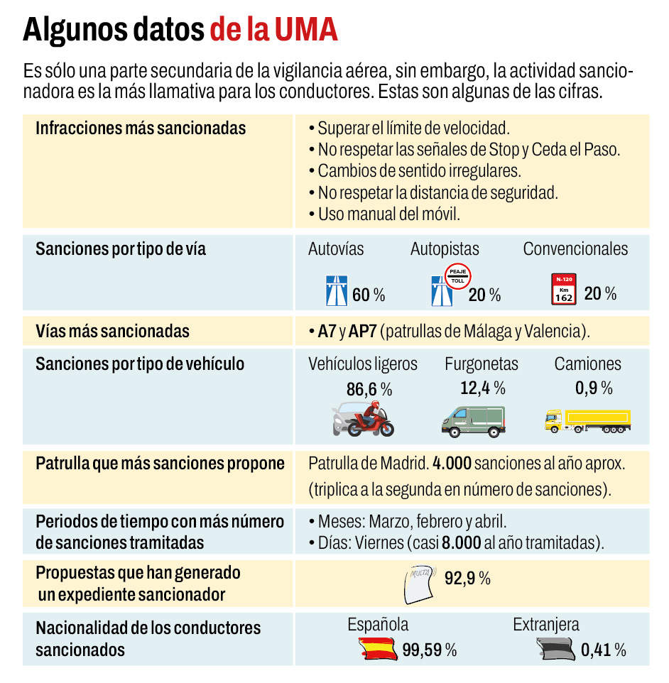 Casi 240.000 horas de vuelo. El balance de la misión en la que hemos acompañado a Suárez y Gamo es satisfactorio: se han transmitido imágenes al centro de gestión de tráfico, controlado varias vías de circulación y detectado siete conductas de riesgo que podrían ser sancionadas por el Centro Estrada. Pero lo más importante “es que, al advertir nuestra presencia, esos conductores han levantado el pie del acelerador”, insiste Alejandro Suárez.